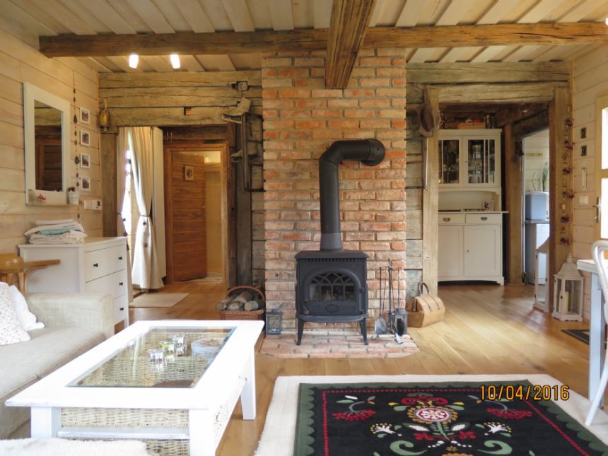 ležajem za dvoje za razvlačenje, sa finskom peći na drva, stolom za blagovanje,